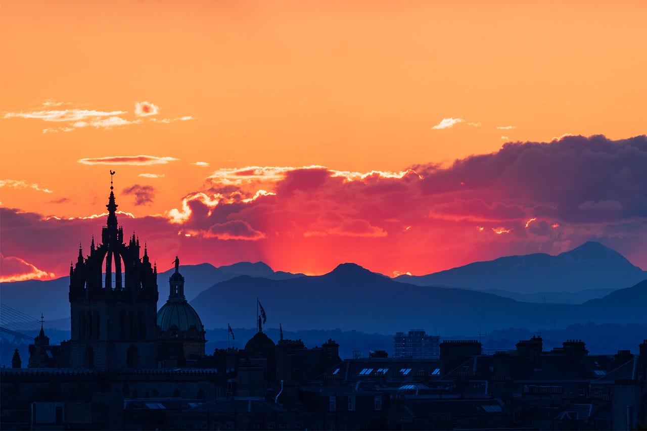 May - St Giles Cathedral with the sun setting behind the distant mountains of the Trossachs.
