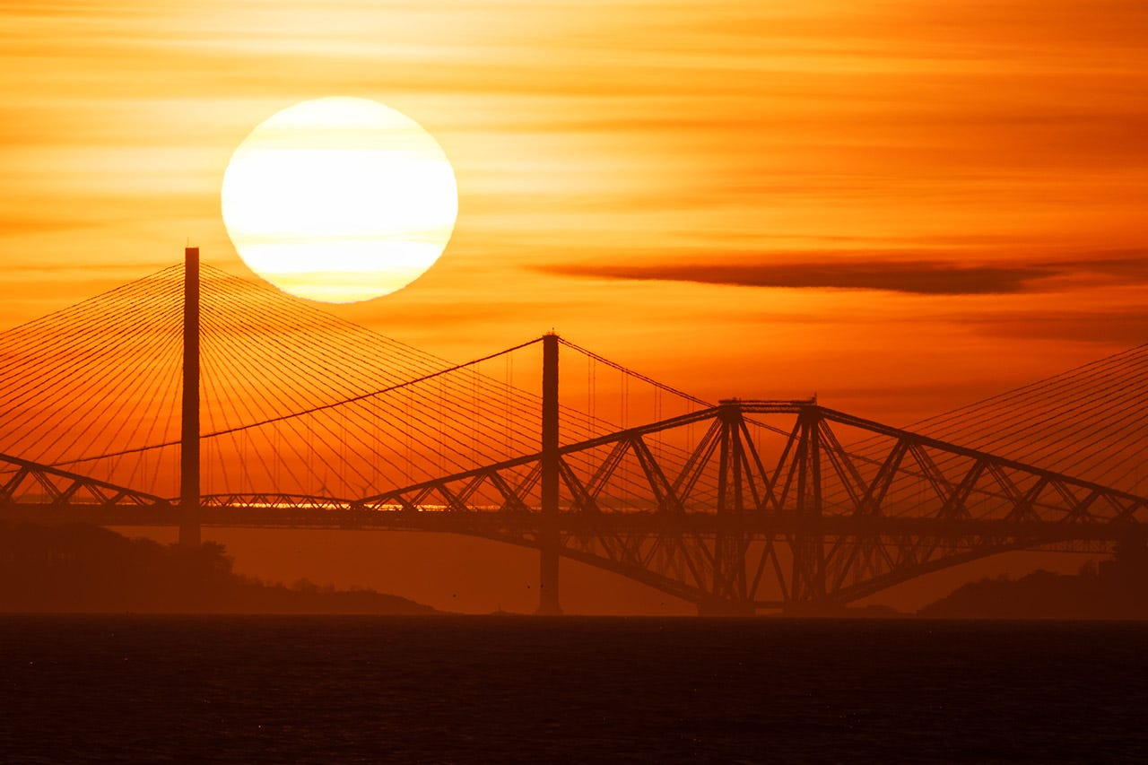 March - 3 Forth Bridges at sunset from miles away - 500mm lens and then cropped some.