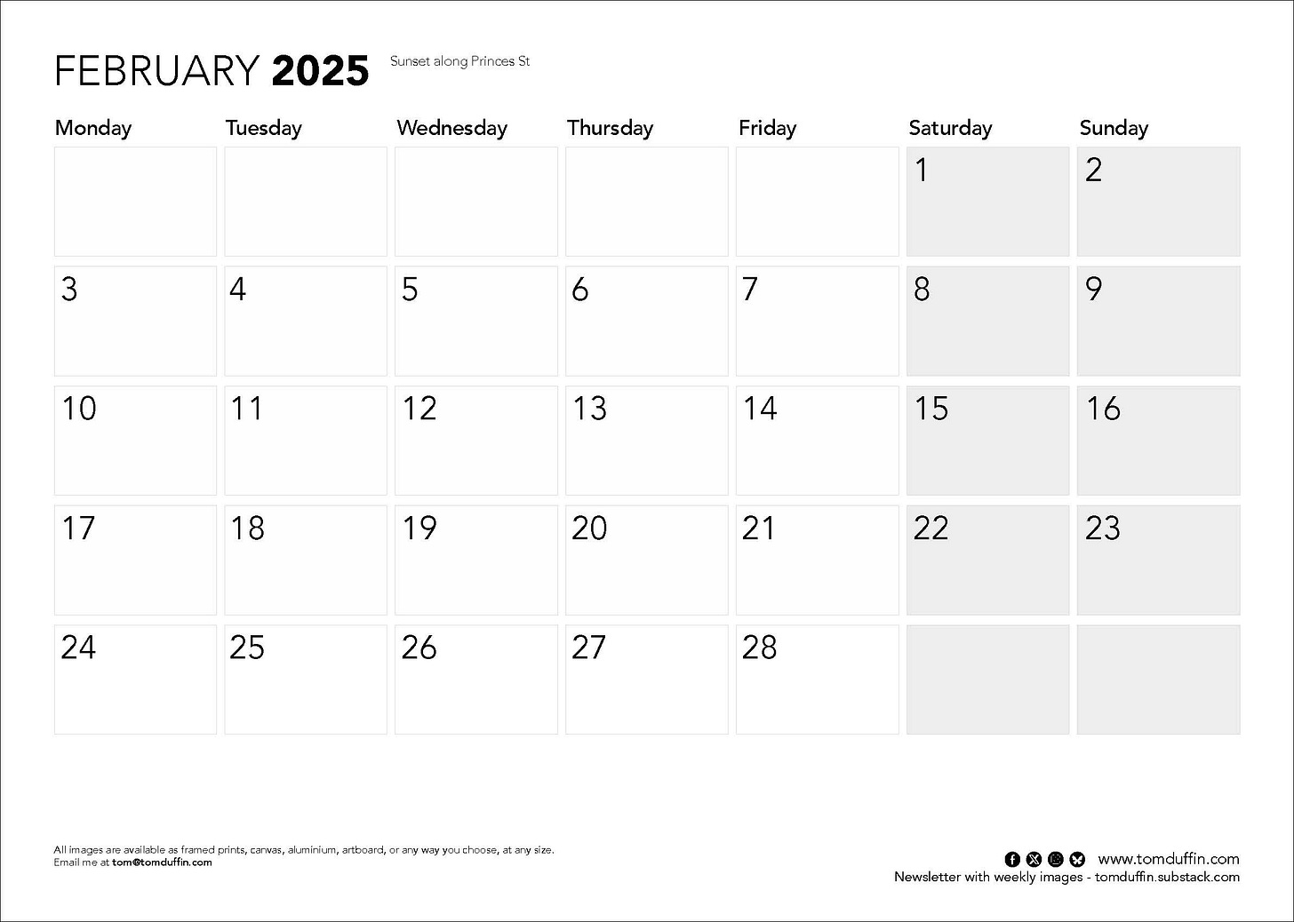 Sunset happens along the line of Edinburgh’s main city centre shopping street during the months of February & October. What I failed to mention when I offered it to you as a choice for February was that I took this image during Lockdown - hence the almost empty street at 6-7pm. It’ll probably be impossible to replicate this shot as the streets are never this quiet of people and traffic at that time of day.